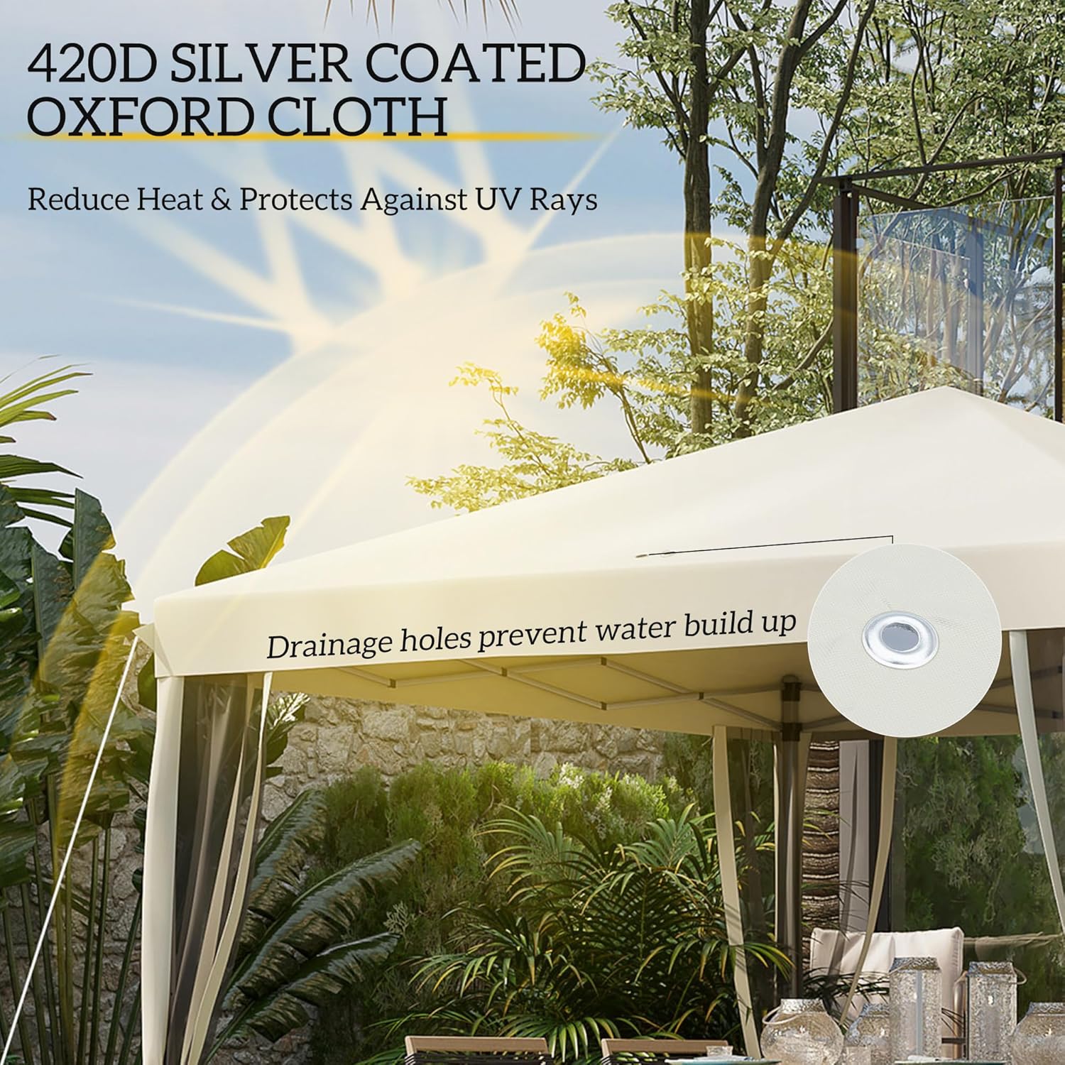 Safety and durability are prioritized with quality materials and thoughtful design. The frame is constructed from durable Steel, and the top is made from lightweight yet protective Oxford Fabric. The top includes drain holes to prevent water from accumulating, which reduces the weight load and strain on the structure. This instant canopy provides protective shade, high versatility, and includes the necessary stakes and guy ropes for secure anchoring.