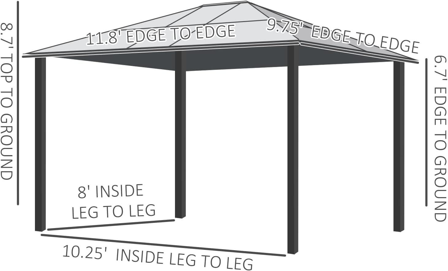 Patio Gazebo Info: Overall Dimensions: 11.8′ L x 9.7′ W x 8.7′ H, Eaves Height: 6.7′ H. Assembly required. Avoid extreme weather, such as floods, snow, or strong wind.