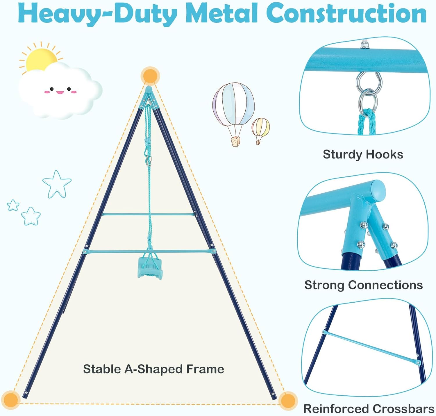 Material Heavy-duty Steel Pipe (Frame), PE Rope (Swing), Plastic (Seat)
