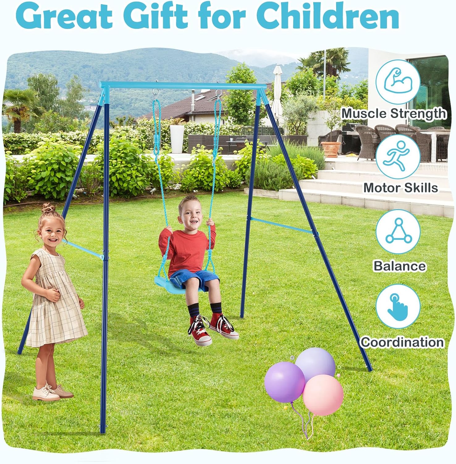 A primary convenience feature is the ease of assembly. This metal Swing set includes clear instructions and all necessary accessories for a straightforward setup. You can quickly set it up in your backyard, garden, or playground, allowing your child to start enjoying outdoor play in virtually no time. It is designed for both indoor and outdoor environments.
